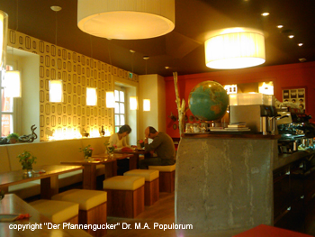 Neben dem Ambiente trägt auch die Freundlichkeit und Aufmerksamkeit des Personals zum Wohlfühlen bei - hier fühlte sich der Pfannengucker sofort gut aufgehoben und nicht als "lästige Kundschaft", die es schnell abzumelken gilt, wie anderswo in dieser tourismuszentrierten Stadt schon vielfach erlebt. Der Pfannengucker bestellte sich ein "Frühstück GrünGelbRot" um 9,70.- Eine Eierspeise mit Paprika, Tomaten, Basilikum, garniert mit frischen Basilikumsblättern. Ausgezeichnet, selten so eine "gschmackige" Eierspeise gegessen. Dazu einen frisch gebackenen "Basilikumzopf", auch sehr lecker, ein bisschen rescher hätte er sein können. Da der Pfannengucker ein passionierter Teetrinker ist bestellte er auch in diesem Lokal, wo frisch Kaffee geröstet und auch verkauft wird, einen Darjeeling. Auch hier zeigte sich Liebe zum Design im kleinen, ein nettes "Tea for One"- Service, dazu eine Zuckermenage mit dreierlei Zucker sowie eine ungewöhnlich designete Sanduhr zwecks exakter Brühzeit des Tees. Die Begleitung des Pfannenguckers bestellte sich das "Frühstück Vital", ebenfalls um 9,70.- Dies beinhaltete eine Portion Frischkäseaufstrich, dazu ein rundes Kornsemmerl. Weiters ein leckeres Müsli mit Früchten. Als Getränk wurde ein Caffé Latte geordert. Auch die Begleitung war restlos zufrieden mit dem Frühstück. Auf der Karte standen noch einige weitere Früstücksvariationen, wo es sich sicher lohnt, diese einmal auszuprobieren. Im Lokal wird Kaffee frisch geröstet, dieser kann dort ebenso wie über den Webshop käuflich erworben werden. In der warmen Jahreszeit gibt es ein paar Tische extra vor dem Lokal. Fazit: Sehr zu empfehlen. Als Teeliebhaber würde sich der Pfannengucker natürlich über einen offenen Blatt-Tee statt einem Teebeutel sehr freuen. Anregung: Auf der Webseite gibt es überhaupt keine Angaben zu Speisen und Getränken im Café, nur zu den Kaffeesorten. Eine "Onlinekarte" sollte heute aber Standard sein - das 220° hat ja diesbezüglich nichts zu verbergen, im Gegenteil. Bericht von: Der Pfannengucker; Lokalbesuch im Mai 2010